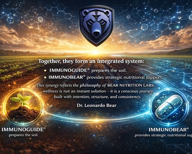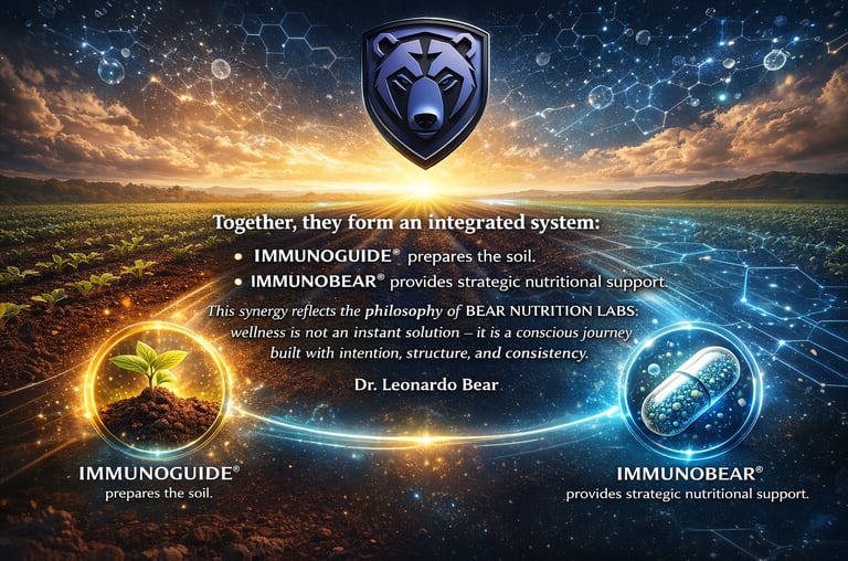 In addition, I developed IMMUNOBEAR® and IMMUNOGUIDE™, solutions that represent the practical application of this philosophy: preparing the organism while providing intelligent, synergistic nutritional support.
