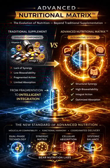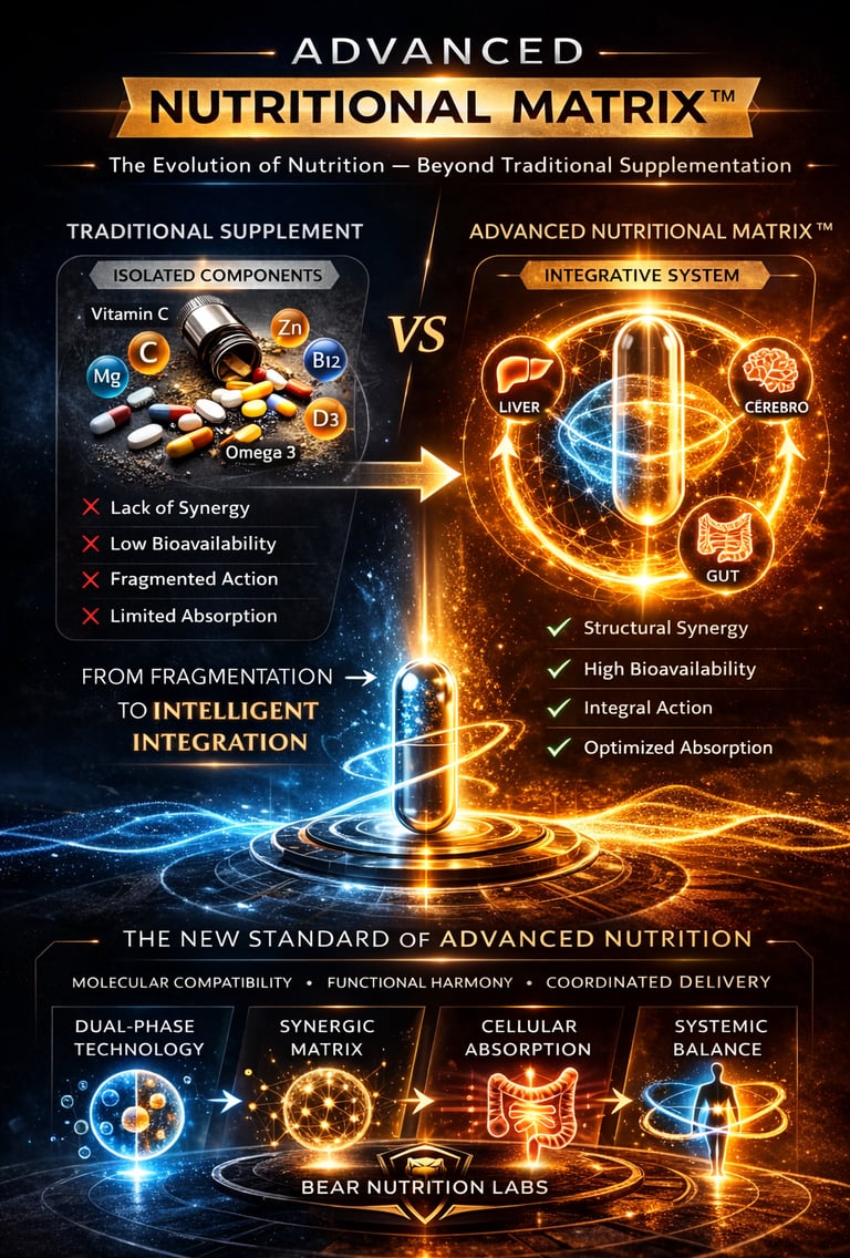 While the conventional model tends to fragment ingredients into formulas based on trends or promotional appeals, the Advanced Nutritional Matrix™ organizes nutrients into a cohesive system, grounded in molecular compatibility, structural synergy, absorption dynamics, and formulational coherence. The focus is not on quantity, but on intelligent integration. It's not about excess, but about functional harmony with a clear purpose.